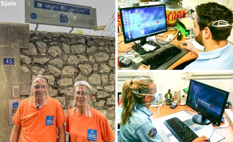Après avoir offert des marquages adhésifs aux sapeurs-pompiers de Montpellier, Sÿnia a souhaité remercier d’autres héros du quotidien. Nous sommes heureux d’avoir pu apporter notre soutien au niveau local en offrant des centaines de visières de protection anti-projection. Les bénévoles de l’accueil de jour du Secours Catholique à la Halte Solidarité de Montpellier, et les gendarmes et policiers de plusieurs communes de la région ont été équipés de visières de protection. Moins anxiogène que le masque et plus agréable à porter, la visière de protection a pour objectif de les accompagner dans leurs missions et de faciliter leurs approches sociales.